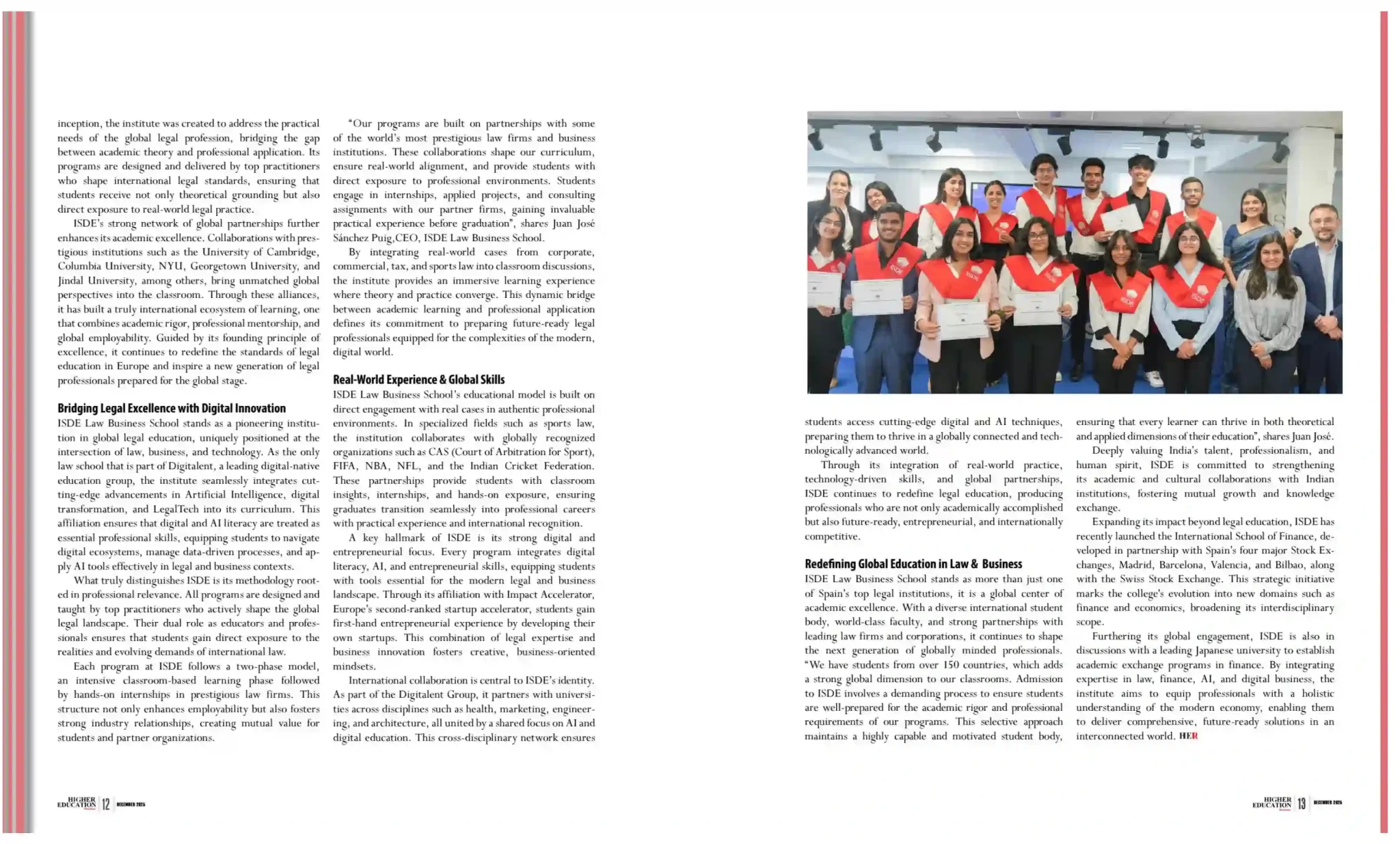 Desde su fundación, ISDE ha formado a más de 40,000 estudiantes a través de sus programas, construyendo una comunidad global de profesionales. Su modelo educativo se basa en programas diseñados e impartidos por profesionales en activo, integrando tecnología, innovación y LegalTech en cada etapa del aprendizaje. Las colaboraciones con instituciones de prestigio como la University of Cambridge, Columbia, New York University y Georgetown University, junto con asociaciones con organizaciones como FIFA, la National Basketball Association (NBA), la National Football League (NFL) y la Indian Cricket Federation, permiten a los estudiantes combinar teoría y práctica en un entorno verdaderamente global y altamente profesional.